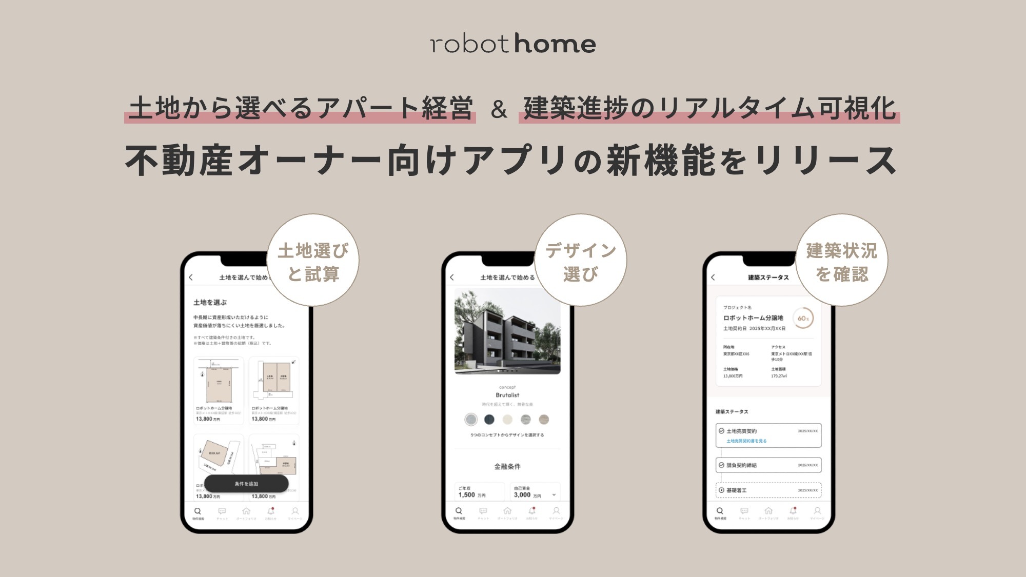 AIとITの力で不動産経営を変革!robot homeアプリが「土地から選べるアパート経営」と「建築進捗のリアルタイム可視化」機能をリリース株式会社robot home(本社:東京都中央区/代表取締役CEO:古木大咲/証券コード:1435、以下当社)は、AIとITを活用した不動産オーナーアプリ「robot home」に、「土地から選べるアパート経営」と「建築進捗をリアルタイムで可視化」する新機能をリリースしたことをお知らせします。